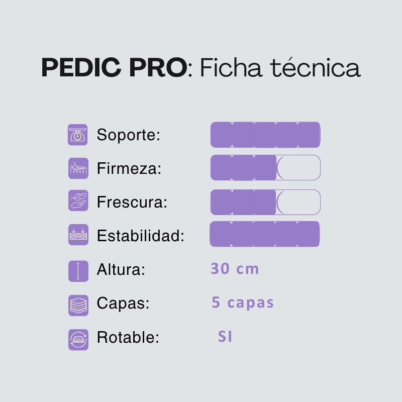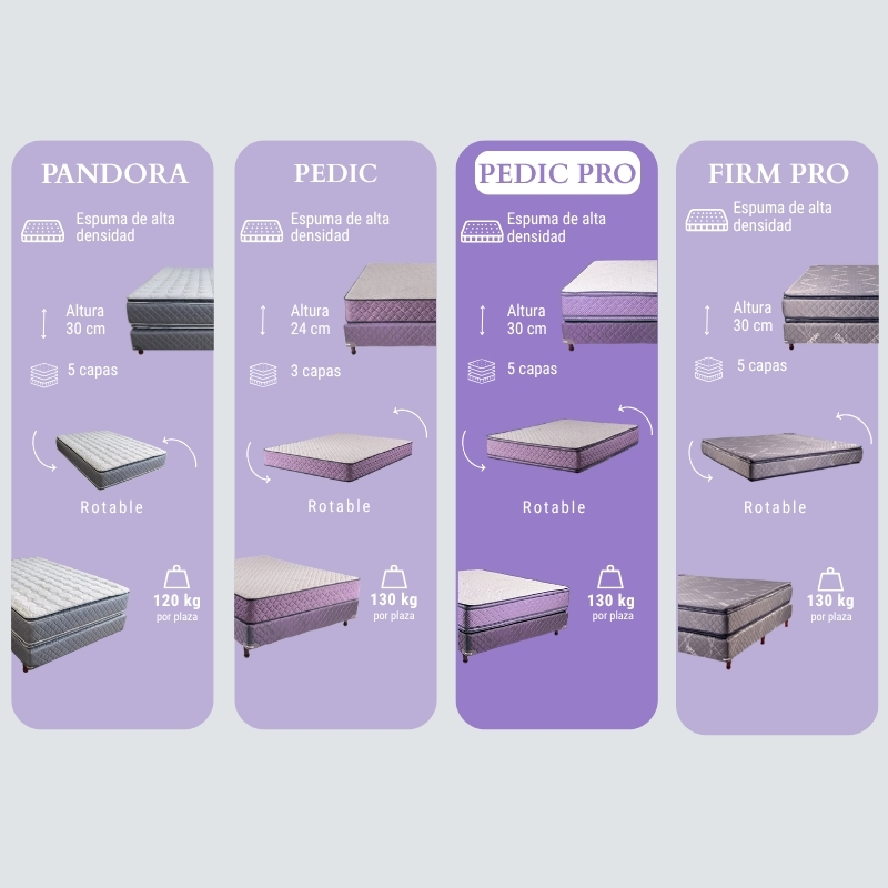 El modelo de espuma de alta densidad de 35 kg/m3 posee un perfecto equilibrio ergonómico que garantiza una correcta postura corporal, previene contracturas, artrosis, artritis, lumbalgias y es ideal para soportar diferentes pesos. Pedic se distingue por un soft superior que atenúa el tipo de descanso ubicado sobre bloque de espuma en alta densidad. Pensado para gente de gran contextura física y/o lesión cervical. Resistente y de larga duración. La composición de su tela es de tejido de algodón gentle que aporta suavidad al modelo. Posee doble Pillow Top que eleva el descanso al mayor confort brindando una respuesta suave y anatómica para el cuerpo.