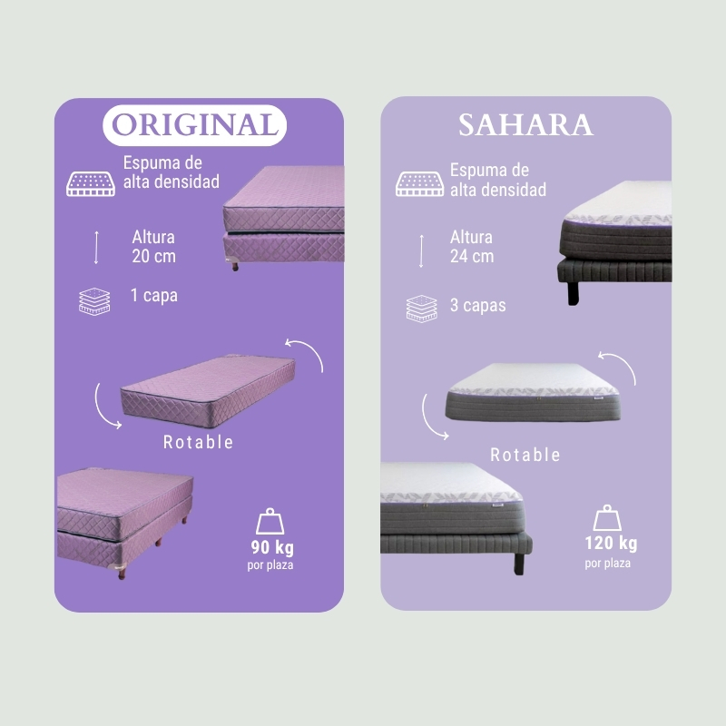 Estructura de espuma de poliuretano en block de alta densidad (25 kg). Evita la deformación del colchón y otorga una superficie de descanso extremadamente estable de lado a lado. Su tela jackard totalmente matelaseada es ideal para su fácil cuidado y durabilidad en el tiempo.