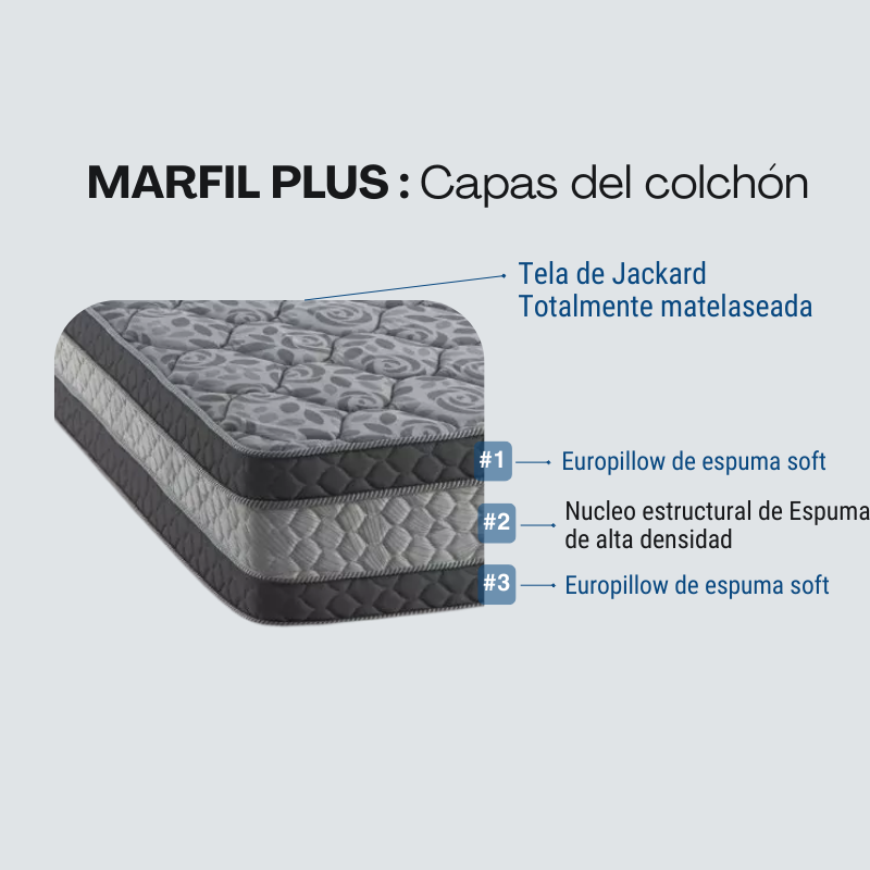 El colchón Marfil Plus exclusivo de la tienda, está desarrollado con espuma en alta presión, esto genera una mayor homogeneidad en sus celdas, prolongando la vida útil del producto. Su característica de densidad alta proporciona una firmeza adecuada para la resistencia de unos 130 kg. por plaza.