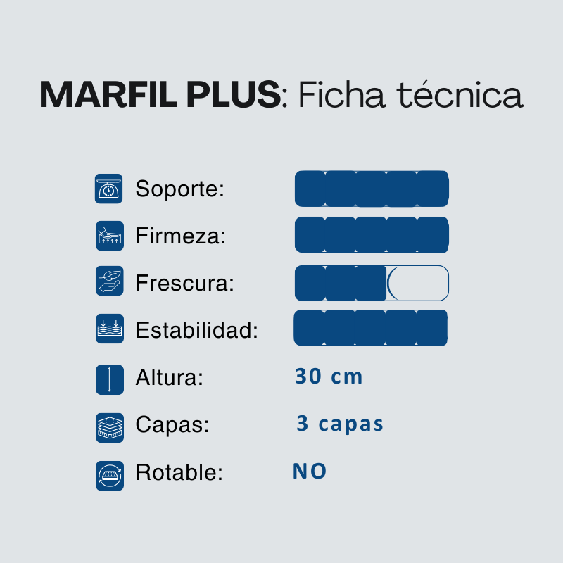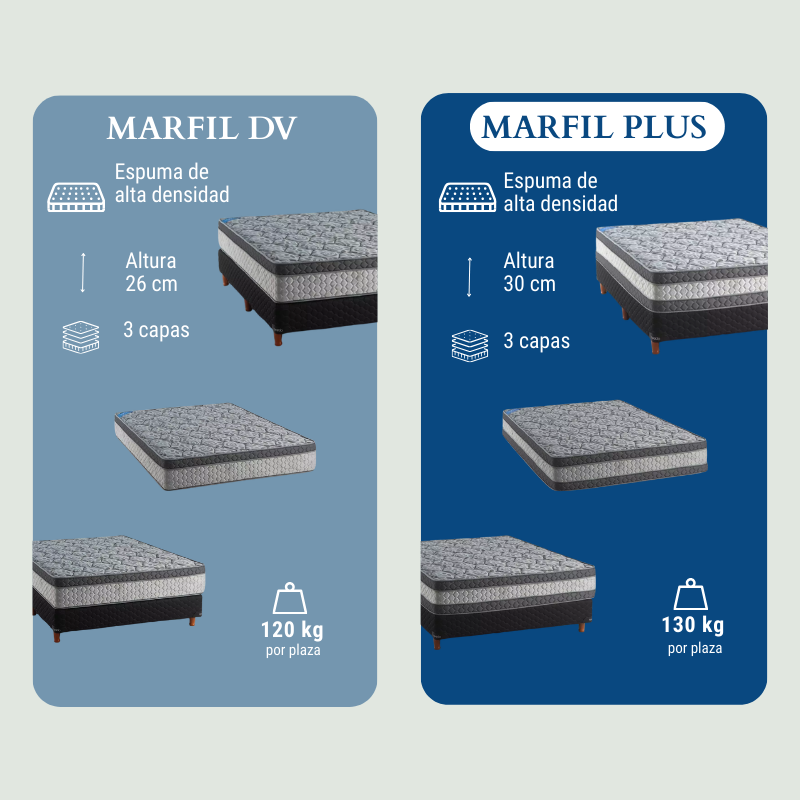 El colchón Marfil Plus exclusivo de la tienda, está desarrollado con espuma en alta presión, esto genera una mayor homogeneidad en sus celdas, prolongando la vida útil del producto. Su característica de densidad alta proporciona una firmeza adecuada para la resistencia de unos 130 kg. por plaza.